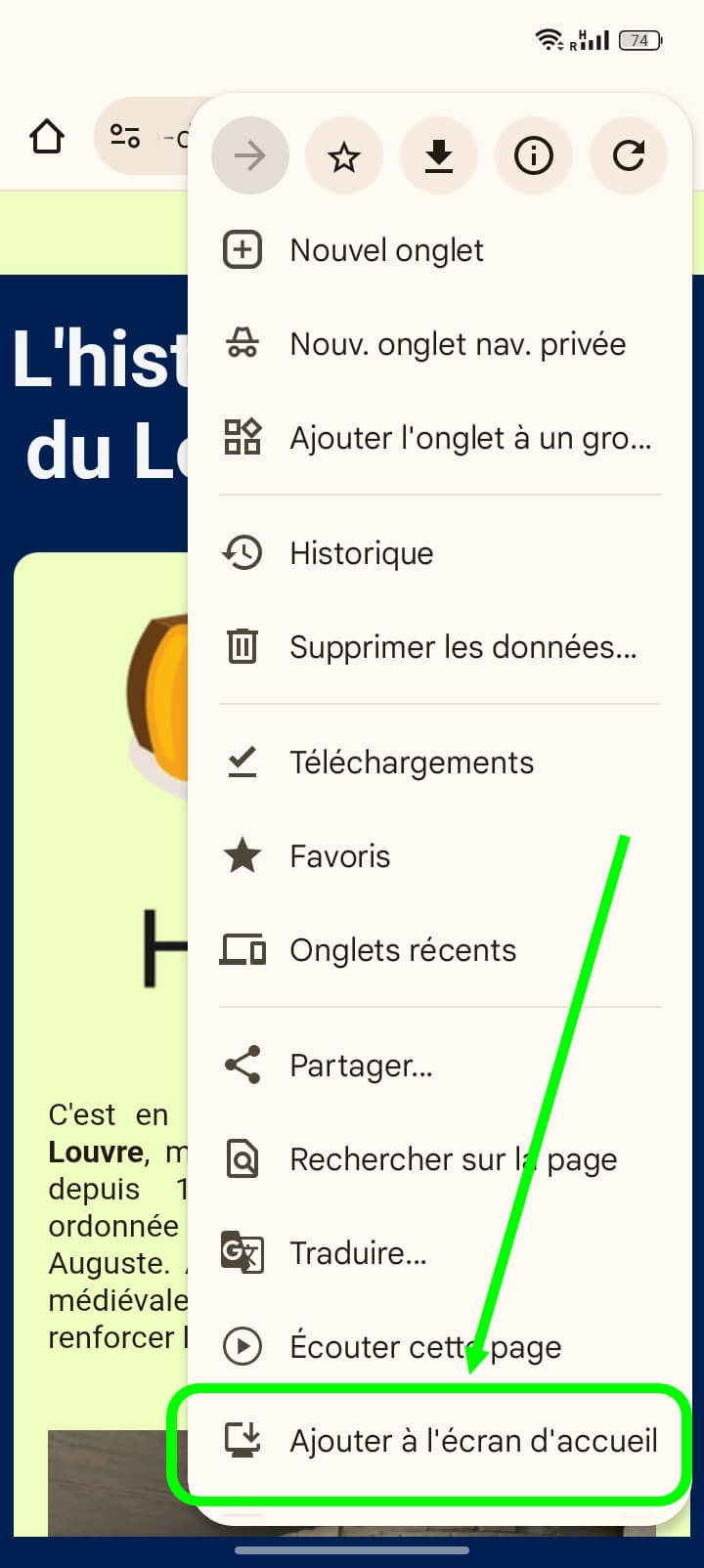 Un menu déroulant s'affiche, tout en bas, cliquez sur "Ajouter à l'écran d'accueil", puis confirmez l'installation en cliquant sur "installer".